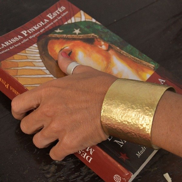 Brazalete realizado a mano combinando diferentes técnicas de orfebrería.